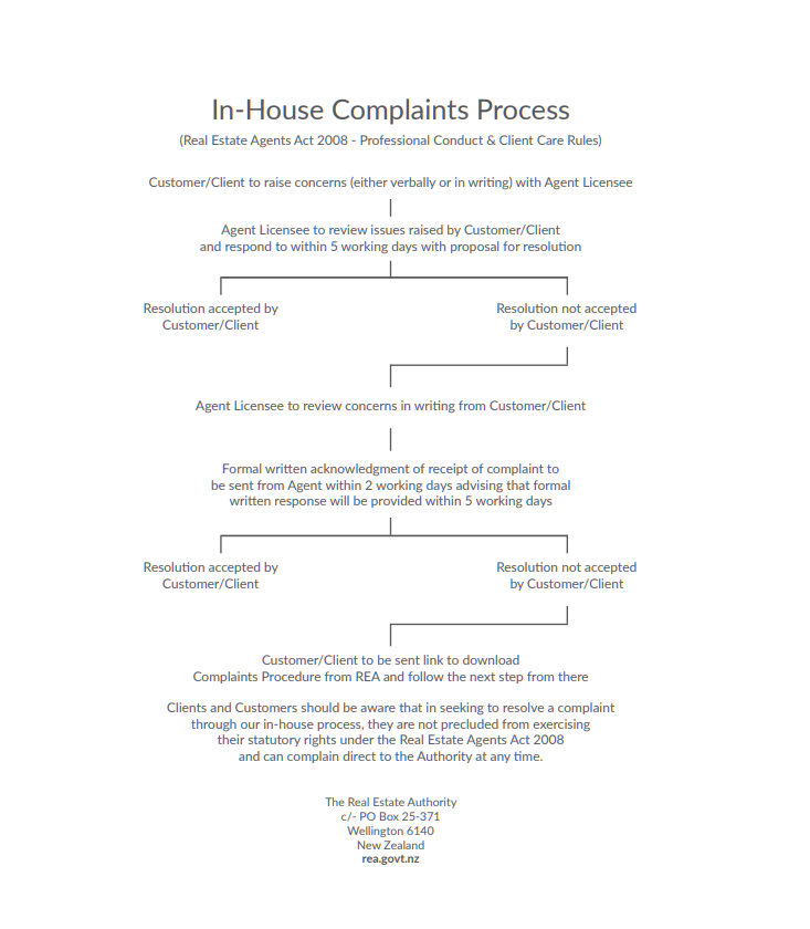 All licensed real estate agents are required to have a written in-house complaint and dispute resolution procedure. That procedure is set out below.
